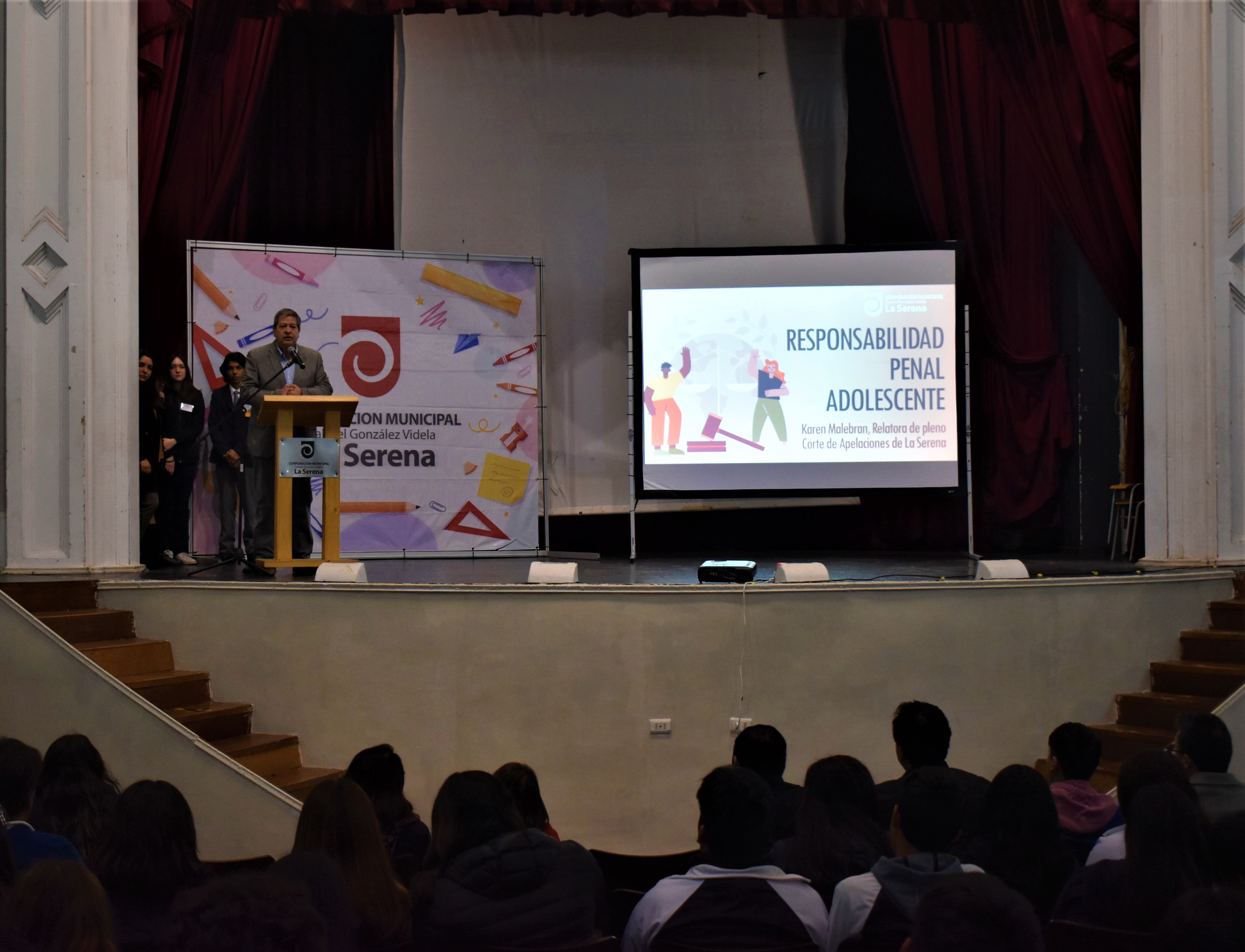 Presente en la actividad organizada por la Corporación Municipal Gabriel González Videla de La Serena, Ernesto Velasco Rodríguez, secretario general, comenta. “Es muy relevante hacer una charla en la que el Presidente de la Corte de Apelaciones, la Relatora, le den una exposición sobre lo que es la responsabilidad penal adolescente a los distintos centros de alumnos. Creo que primero es una responsabilidad cívica, segundo aprender a cómo convivimos en sociedad en la que valores como la solidaridad, la inclusión, nos hagan ver que enfrentar el bullying, el ciberbullying y el mal trato, tiene que ver con lo que son nuestro conocimiento y también nuestro rol como sociedad, los valores que como educación podemos transmitir, así que hermoso tener el teatro lleno en el que niños, niñas y jóvenes estén disponibles para aprender, reflexionar y discutir sobre lo que son sus derechos y deberes de convivir en sociedad”.