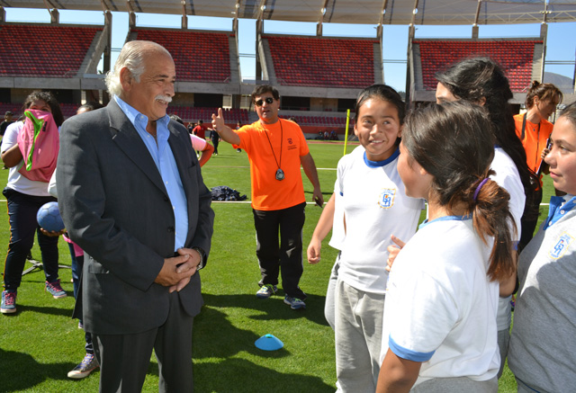 Disciplinas de rugby, hándbol, fútbol femenino y masculino, atletismo, basquetbol, entre otras actividades deportivas, practicaron los estudiantes de 7° básico, en la cancha y pista atlética del estadio mundialista. Durante el desarrollo de la jornada, el alcalde Roberto Jacob Jure, acompañado del secretario general de la Corporación Municipal, Patricio Bacho Chávez, y del coordinador de la Unidad Curricular y Formativa del departamento de Educación, Luis Tabilo López, dieron el punta pie inicial, en una divertido juego de fútbol, entre las autoridades y los alumnos de los Colegios Arturo Prat Chacón y Villa San Bartolomé.