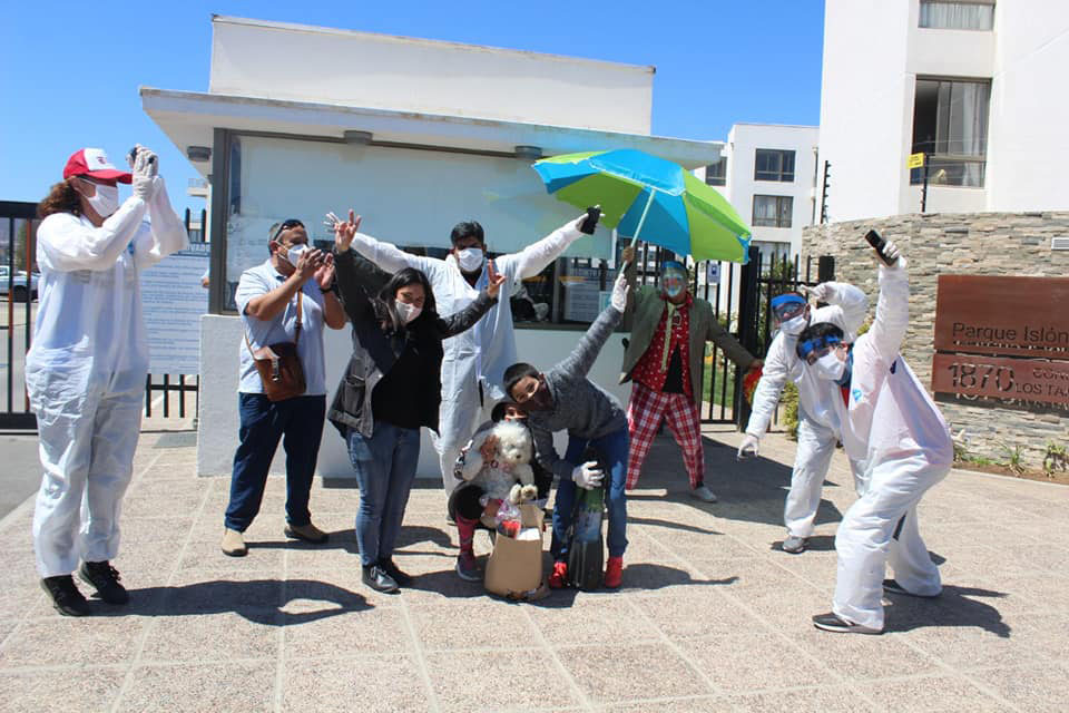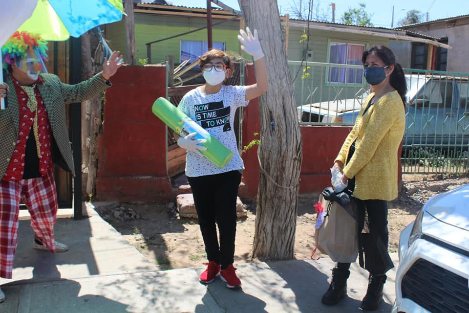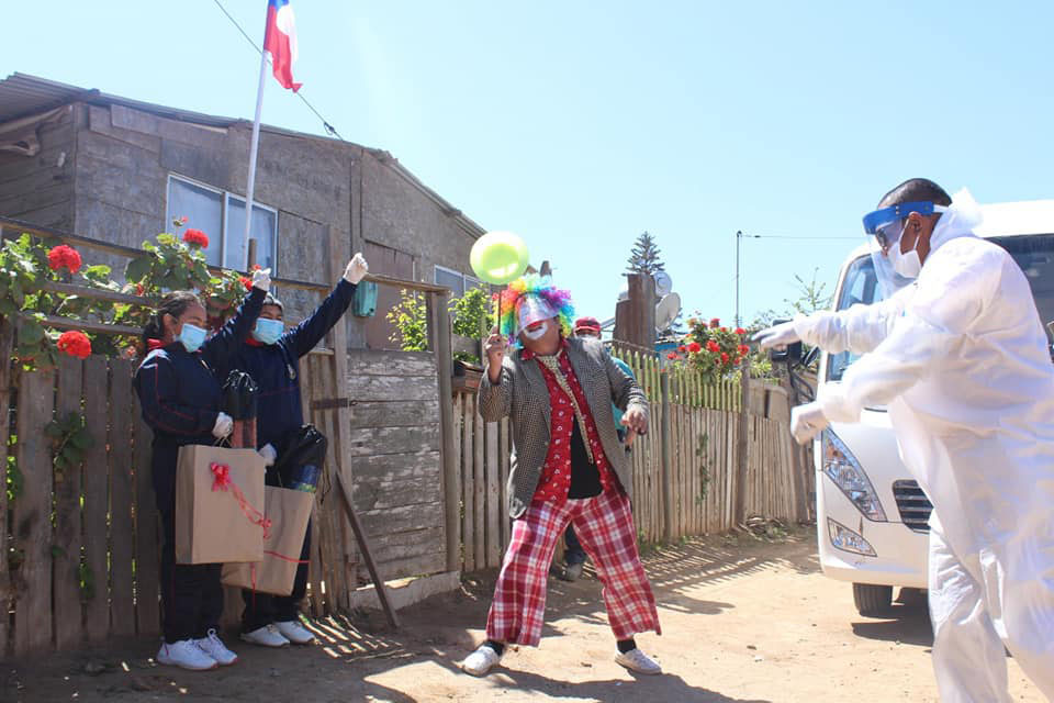 Parte del equipo del área de Educación Municipal junto a la compañía del divertido payasito “Patín”, interpretado por Patricio Ramírez, actor y docente del Colegio Bernarda Morín, hicieron entrega de un set de implementación de entrenamiento.
