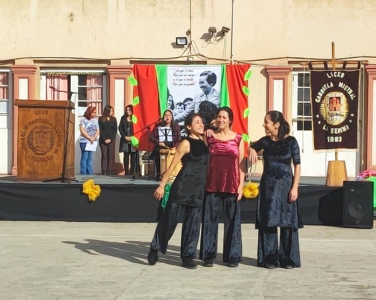 Posteriormente, un homenaje lleno de arte y poesía realizó el Departamento de Lengua y Filosofía, quien en un acto en la cancha del establecimiento, frente a todos los estudiantes, relataron sobre los destacados hitos de la vida de Mistral, como también la lectura de poemas y una presentación musical y baile a cargo de los profesores María Alejandra Michea, Fernando Rojas y el colectivo de danza “La Manada”.