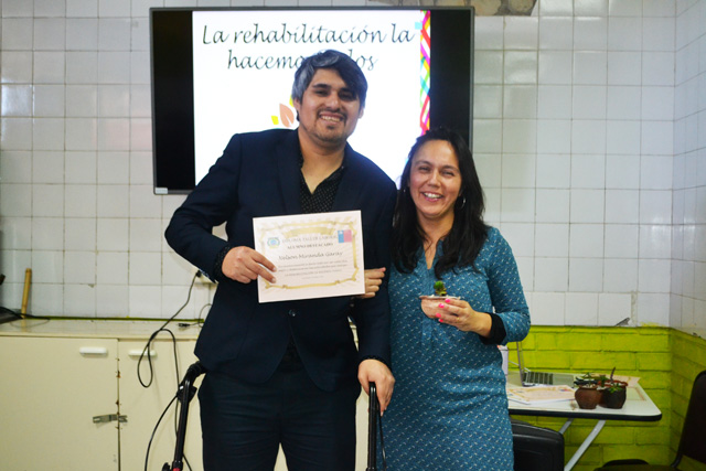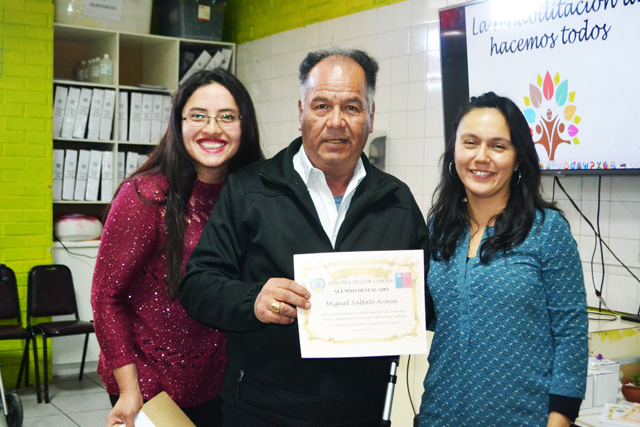 Miguel Salfate Araya, fue reconocido en el Taller de Madera (fabricación de muebles), quien recibe atención, hace dos años en la Sala de Rehabilitación del Cecosf Villa El Indio, producto de un impacto de bala que afectó una de sus caderas. “Espero sigan realizando más talleres para seguir trabajando, mi salud ha ido mejorando notablemente, además, compartes, convives con otras personas, adquieres experiencia, realmente me ha servido mucho. Llegué a rehabilitación, en silla de ruedas, aquí me han atendido muy bien”.
