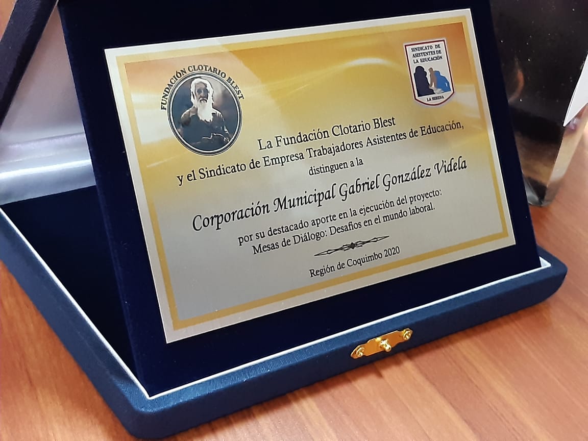 El Sindicato de Empresa Trabajadores Asistentes de Educación, representado por su presidenta Erika Zepeda y sus directores Alonso Díaz y Mireya Bravo, hizo entrega al secretario general de la Corporación Municipal Gabriel González Videla, Patricio Bacho, y a los profesionales de la institución Guido Galloso, John Cortés y Luis Pizarro, un significativo reconocimiento, en mérito al aporte que permitió la ejecución, en conjunto con la Fundación Clotario Blest, del proyecto “Mesas de Diálogo: Desafíos en el mundo laboral”, adjudicado por la SEREMI del Trabajo y Previsión Social.