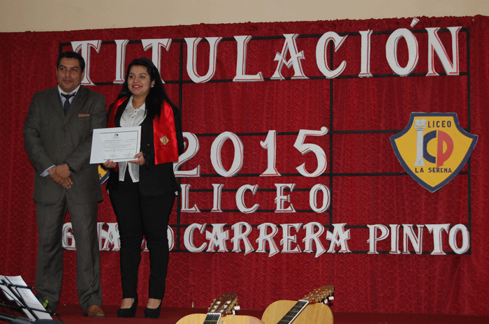 En su discurso de despedida a los estudiantes, la directora del Liceo Técnico Profesional Ignacio Carrera Pinto, María Paulina Darrigrande, felicitó a los licenciados, por cuanto representan, enfatizó, una generación exitosa, pues muchos de ellos ya se encuentran trabajando o bien continuando estudios superiores.