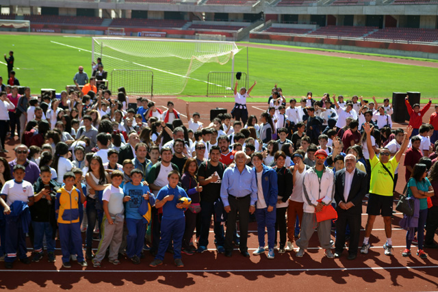 Disciplinas de rugby, hándbol, fútbol femenino y masculino, atletismo, basquetbol, entre otras actividades deportivas, practicaron los estudiantes de 7° básico, en la cancha y pista atlética del estadio mundialista. Durante el desarrollo de la jornada, el alcalde Roberto Jacob Jure, acompañado del secretario general de la Corporación Municipal, Patricio Bacho Chávez, y del coordinador de la Unidad Curricular y Formativa del departamento de Educación, Luis Tabilo López, dieron el punta pie inicial, en una divertido juego de fútbol, entre las autoridades y los alumnos de los Colegios Arturo Prat Chacón y Villa San Bartolomé.