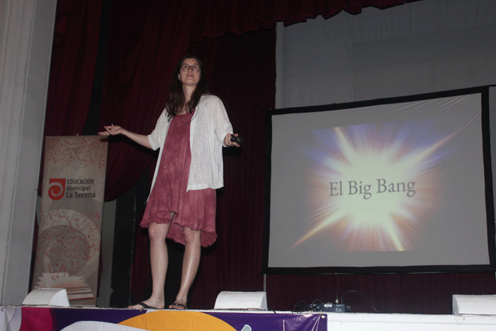 La destacada científica expuso sobre “El comienzo de todo: El Big Bang”, temática que, de principio a fin, cautivó a todas y todos los presentes, congregados en el Teatro Jorge Peña Hen, del Liceo Gregorio Cordovez.