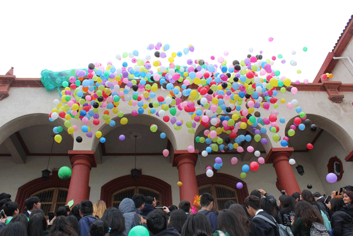 Con una asistencia masiva de estudiantes, ex liceanos, apoderados y público en general, el Liceo Gabriela Mistral inició su mes aniversario en conmemoración de los 135 años de historia con una intervención urbana que se realizó en el pórtico del establecimiento. Los visitantes, tras haber coreado el himno institucional y la tradicional canción de cumpleaños, presenciaron el lanzamiento de cinco mil globos desde el balcón del edificio.