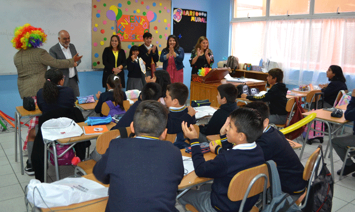Las autoridades de la Corporación Municipal visitaron el Colegio Pedro Aguirre Cerda en compañía del divertido payaso “Clown”, con quien entregaron un motivador saludo de inicio de año escolar, además de regalos sorpresa. La idea, explicó Bacho, es que sirva de incentivo para que los estudiantes continúen esforzándose por aprender.